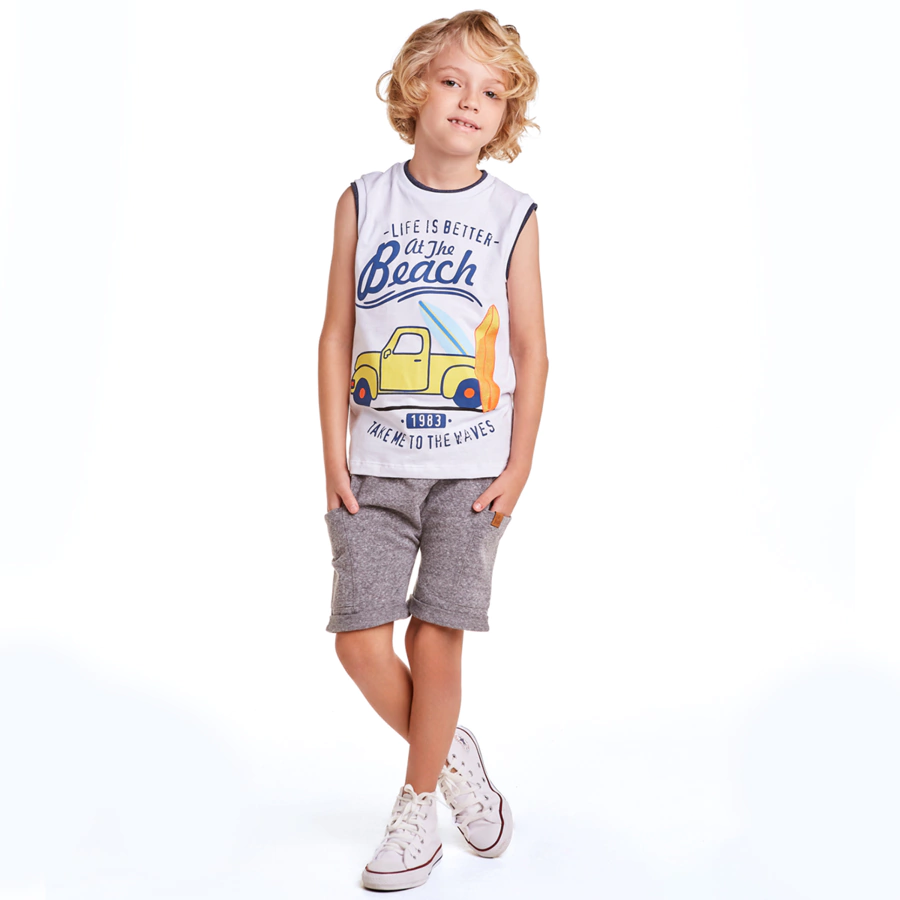 Com a Camiseta regata carros meia malha toddler tip top, seu pequeno ficará estiloso e confortável durante todo o dia. Feita com tecido de meia malha macia e respirável, esta camiseta apresenta uma estampa divertida de Dino e mangas em regata para o melhor frescor nos dias mais quentinhos do ano, e para deixar a peça ainda mais completa conta com um fofo detalhe nas mangas e gola.