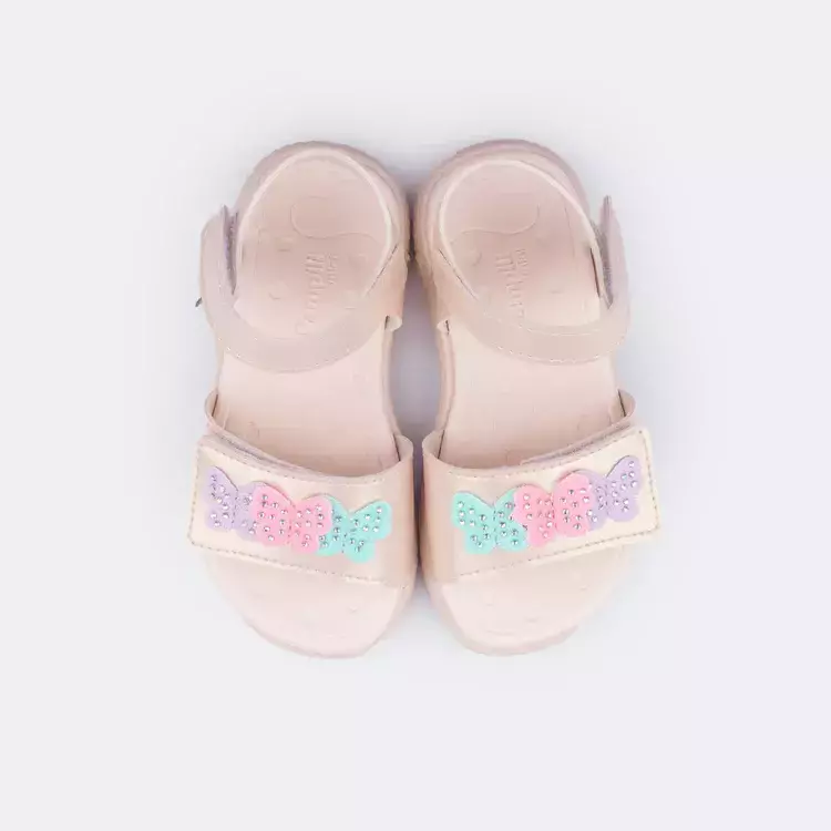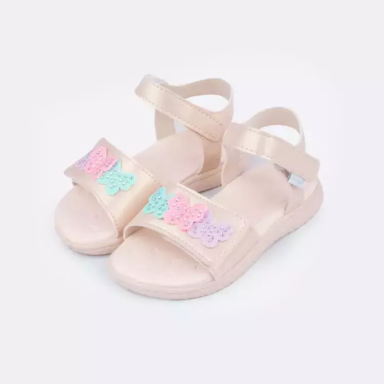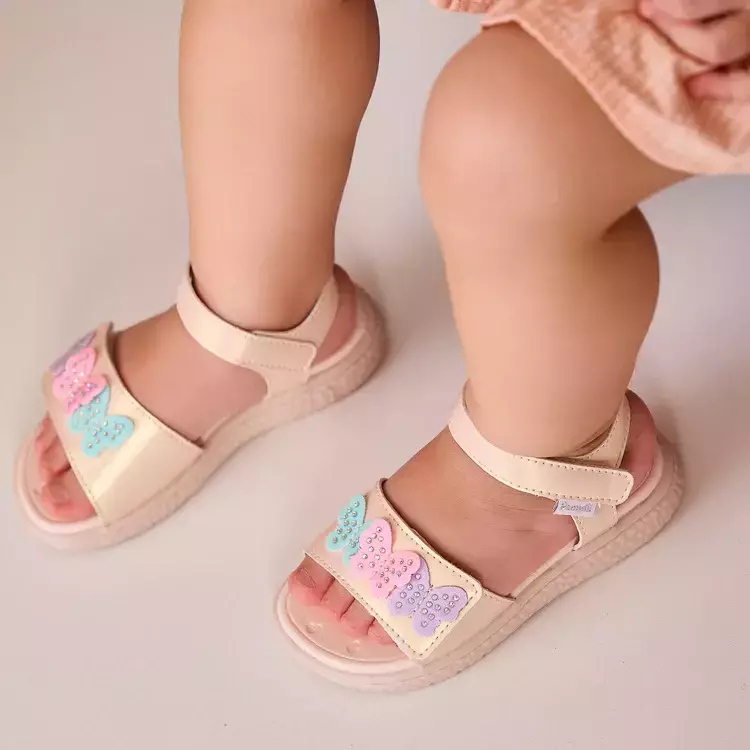 Sandália infantil feminina em material sintético nude com borboletas coloridas bordadas em alto relevo na tira superior e pedrinhas brilhantes, encantadora e confortável para todos os momentos.