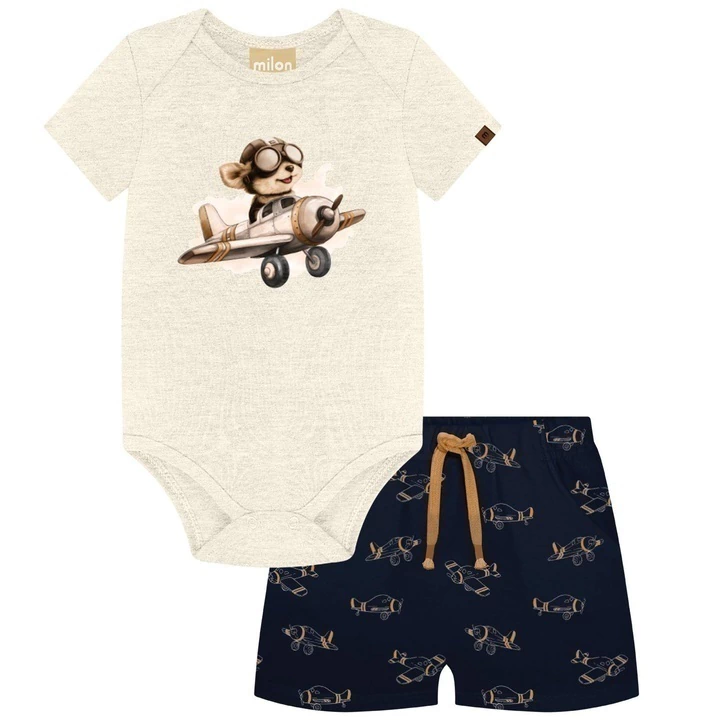 Acompanhando o look, a bermuda em moletinho 100% algodão é super leve e confortável, perfeita para os dias mais quentes. O destaque fica por conta da estampa rotativa de aviões, que traz ainda mais graça e combina de forma lúdica com o body. O cós elástico garante caimento perfeito e praticidade no vestir. Um conjunto que une diversão, conforto e estilo, ideal para acompanhar seu pequeno explorador em todas as aventuras do dia a dia.