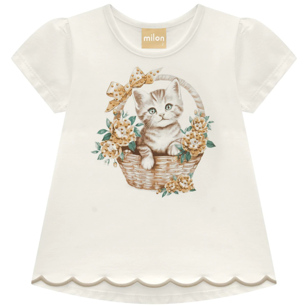 Um charme cheio de doçura e conforto! O conjunto infantil menina Milon é puro encanto e foi criado para deixar o visual das pequenas ainda mais delicado e sofisticado. Perfeito para momentos de diversão e ternura, ele combina aconchego, estilo e um toque lúdico encantador. A blusa, confeccionada em cotton 95% algodão e 5% elastano, possui toque macio e modelagem levemente evasê, garantindo liberdade de movimento e um caimento gracioso. O destaque fica por conta da estampa de gatinho em cesta com flores, adornada por aplicação de strass e laço delicado, que trazem brilho e charme na medida certa. O acabamento da barra em corte a laser forma ondas sutis, deixando a peça ainda mais especial.