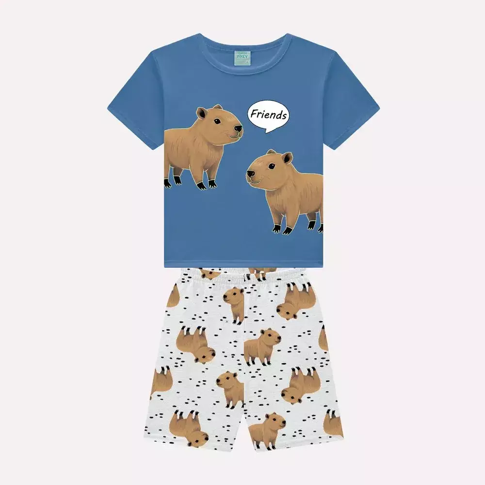 A bermuda completa o conjunto com uma estampa rotativa de capivaras, além de cintura com elástico macio para garantir ajuste e liberdade de movimento. Cheio de personalidade e conforto, esse pijama Kyly é perfeito para os pequenos que adoram bichinhos e muita diversão!