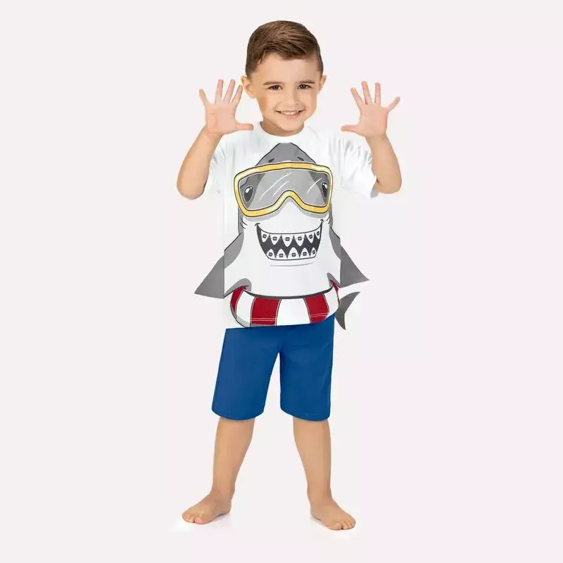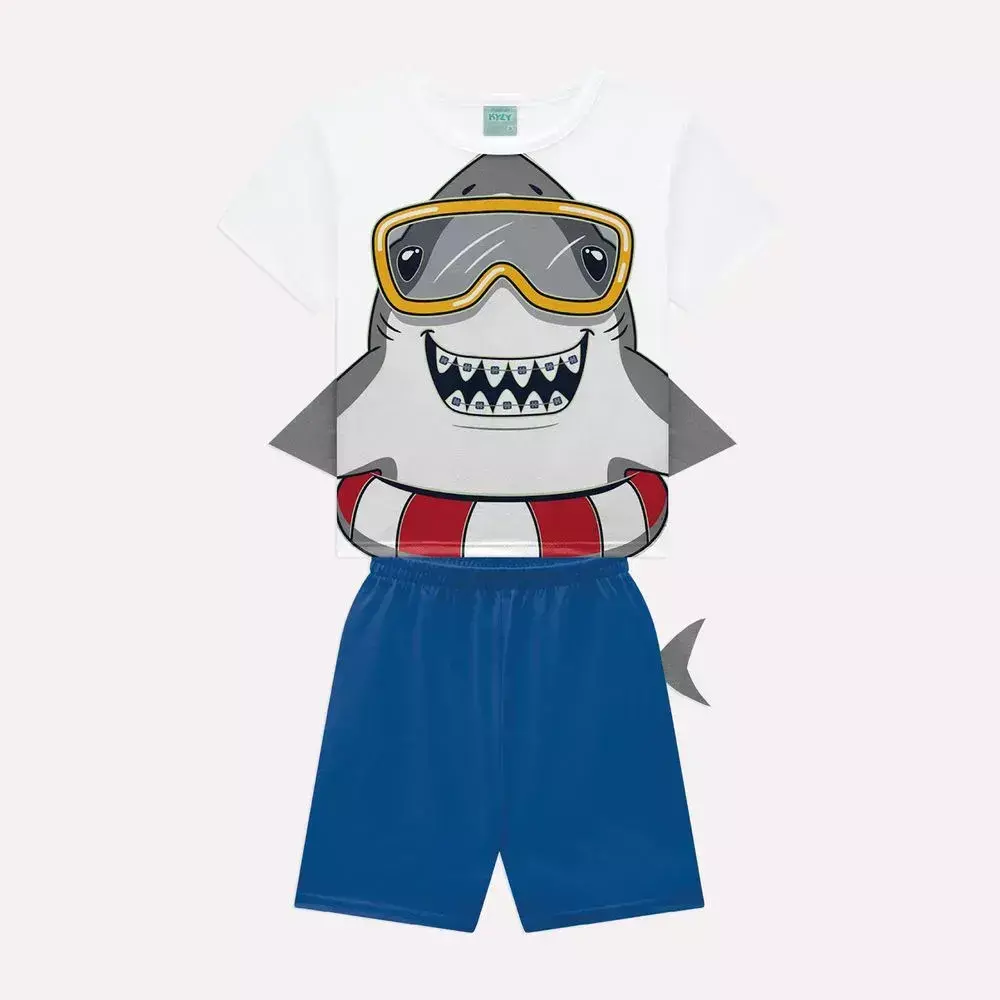 Um mergulho na diversão até a hora de dormir! O pijama infantil menino Kyly é a escolha perfeita para noites cheias de conforto e imaginação. Confeccionado em meia malha 100% algodão, o tecido é leve, macio e respirável, garantindo um toque suave na pele e um soninho tranquilo. A camiseta tem modelagem tradicional, com decote redondo e estampa divertida de tubarão com óculos de mergulho, que deixa o look cheio de personalidade, e o melhor a estampa brilha no escuro! Os apliques nas nadadeiras laterais tornam o visual ainda mais divertido e lúdico, encantando os pequenos exploradores do fundo do mar.