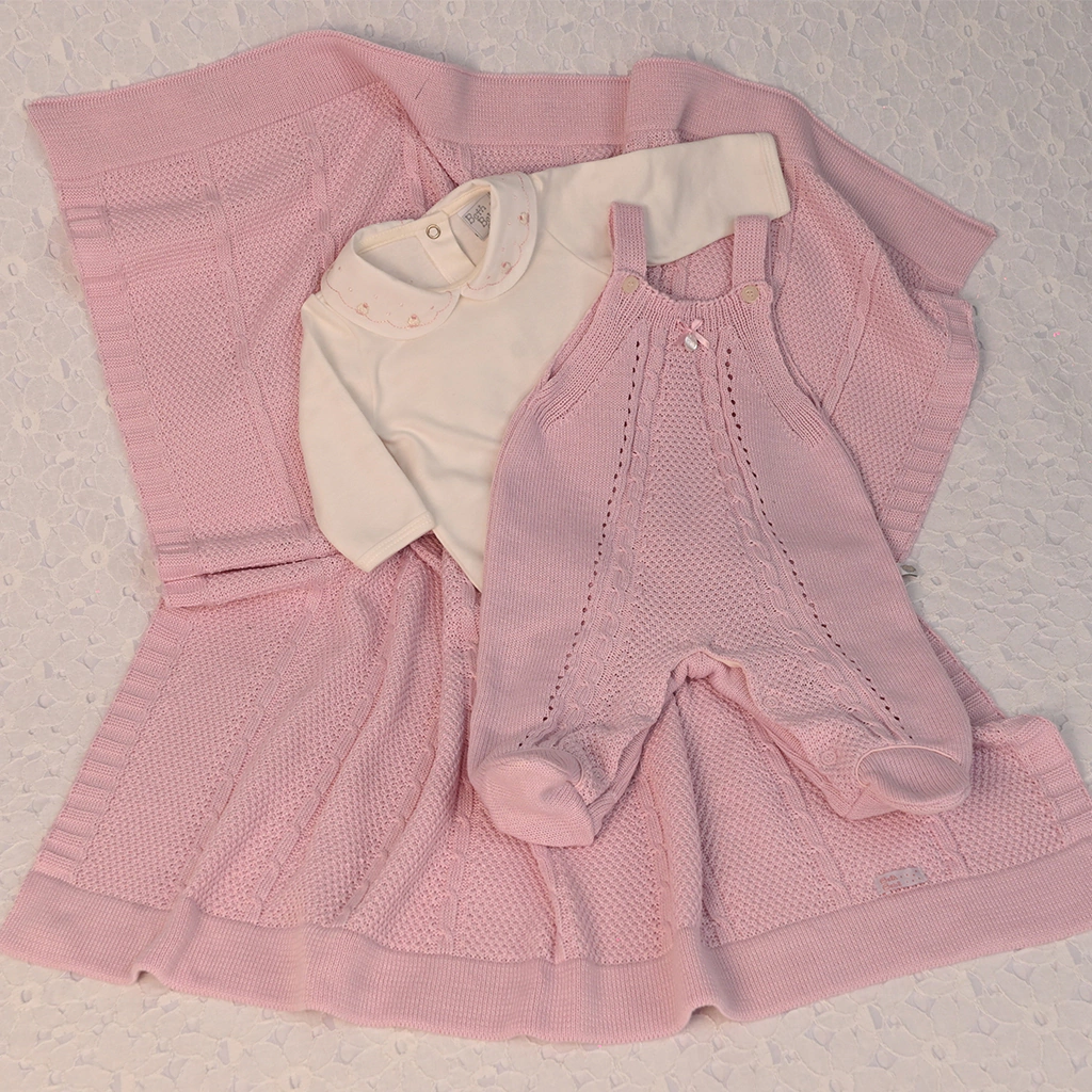 Manta de tricot em ponto trabalhado, combinando com a jardineira.