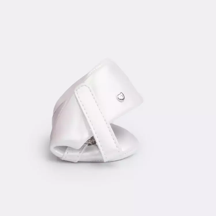 Sapato de bebê em branco perolado, com enfeite em metal em formato de coração com pedrinhas delicadas brilhantes, dando elegância para o calçado. Sapato com forro em tecido e espuma para acolher e cuidar dos pezinhos sem interferir no desenvolvimento natural. Sapato infantil com calce fácil através de velcro, facilitando o dia a dia da mamãe!
