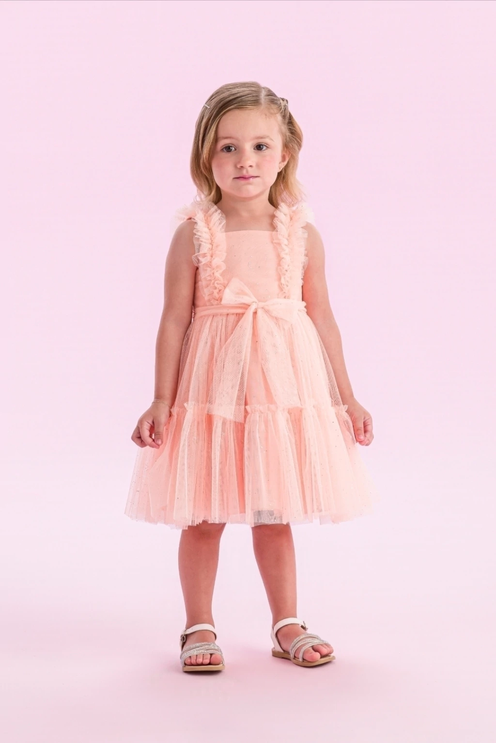 Em TULE Com Brilhos e camadas, modelagem fluida.